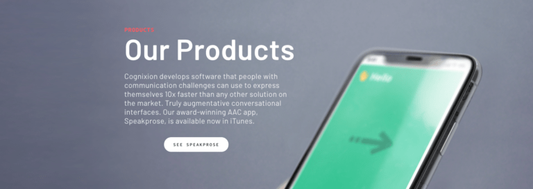Первый программный продукт компании — приложение под названием Speakprose, в настоящее время доступен на iOS. Cognixion также работает над несколькими другими технологиями, включая интерфейсы управления мозгом.