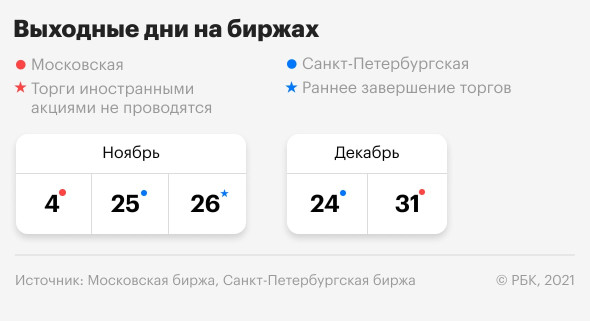 26 ноября 2021 года — раннее завершение торгов (в 21:00 мск) по ценным бумагам эмитентов с листингом в США в связи с Днем благодарения.